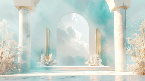A virtual background for a Zoom meeting featuring a sophisticated and elegant design inspired by the wedding industry. The background should have a soft gradient with shades of light blue and turquoise, similar to the image provided. It should include a subtle, luxurious element like a golden logo or abstract column design resembling a modern, high-end bridal company. There should be space for a central focus point where a person's video would appear, surrounded by gentle decorative flourishes that evoke elegance, celebration, and a sense of timeless style. The overall atmosphere should feel professional yet welcoming, suitable for a wedding consulting or training session --ar 16:9 --v 6.0