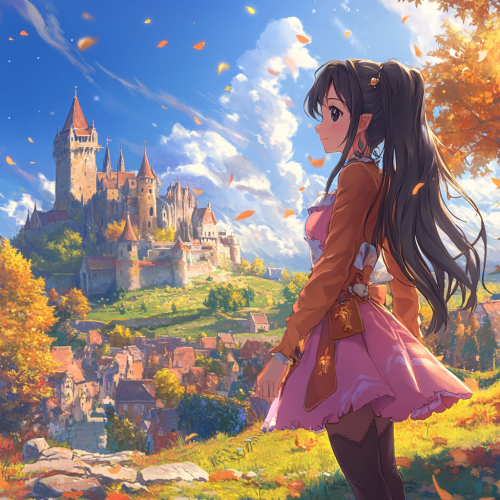 cute anime (isekai style) girl, with very long dark brown hair, fantasy clothing standing in front/next to of a fantasy themed circled castle town, on a field, the sun is shining down brightly and its autmn, leaves falling, ambient lightning, focus on the girl, detailed charater, profile picture