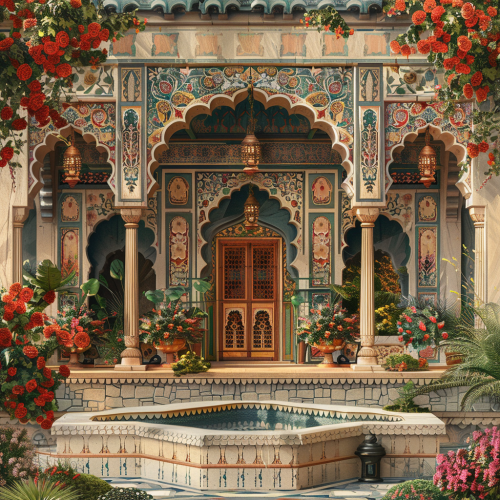 Create a rich and vibrant background inspired by Mughal architecture and art. The scene should feature intricate patterns typical of Mughal design, such as floral motifs, geometric shapes, and ornate calligraphy. Incorporate elements like grand arches, delicate jali work (lattice screens), and lush gardens with fountains. The color palette should include deep reds, golds, and greens, evoking a sense of luxury and history. Additionally, include hints of traditional Mughal elements like peacocks, lanterns, and silk drapes to enhance the cultural essence. The overall feel should be opulent and majestic, reflecting the grandeur of the Mughal Empire. --v 6.0 --s 250 --style raw