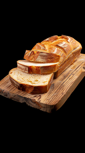 Template for e-commerce, editorial photography: a high-resolution image of a sourdough bread loaf with slices cut out, placed on a wooden board. Totally black background. --ar 9:16 --v 6.0 --style raw