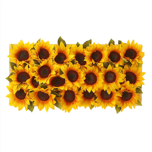 Imagine a group of vibrant and radiant sunflowers arranged within a rectangle. Some of their petals extend and protrude beyond the edges of the rectangle, creating a dynamic and natural effect. The image should be in high definition, with a completely white background that highlights the beauty of the sunflowers and the simplicity of the design.