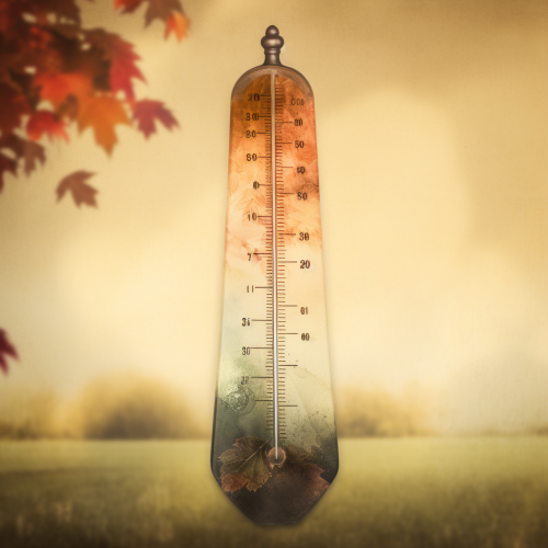 A classic mercury thermometer standing upright, displaying temperature in both Celsius and Fahrenheit with red mercury fluid rising. Behind the thermometer, a large, softly faded silhouette of a tree appears as the background, creating a natural and serene scene. The color palette uses warm, earthy tones inspired by nature, with shades of green, brown, and soft yellows. Gentle sunlight filters through, adding a warm glow that enhances the natural warmth of the scene --v 5.0 --ar 1:1