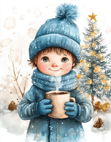 A cute little boy in a blue hat holding a mug, wearing gloves, a watercolor painting clipart with a winter theme, christmas background with Christmas tree and lights, light background --ar 45:58