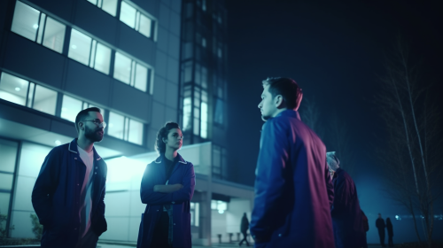 young men and women outside of a hospital expecting news its night, moon light, photorealistic, for power point background, rectangular, vibrant colors, , cinematic lighting, 16:9 aspect ratio --ar 16:9 --v 5.0