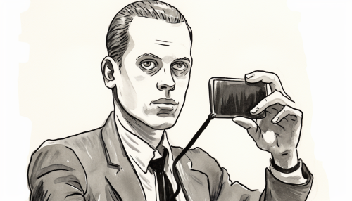 A black and white Kate Beaton cartoon William Bernbach portrait, taking a selfie, an IPHONE on hand, a cartoon, with an ambiguous image, understated sophistication, dotted, poignant, happening, washed. --ar 7:4 --seed 2425404260