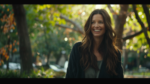 Horizontal 4K image of a cheerful kate beckinsale , dressed in a dark black cardigan and casual attire, standing in a lively park and trees. Her smile is bright, natural light highlighting her features, and the background shows a blend of city and greenery. Shot with Nikon Z9, cinematic clarity, high-definition detail --ar 16:9 --v 6.0
