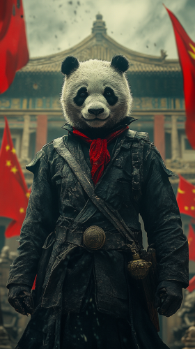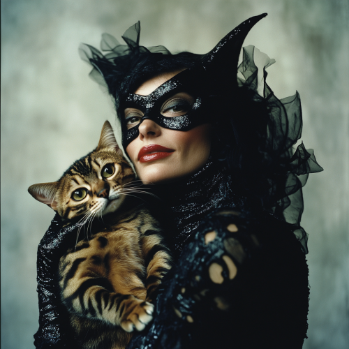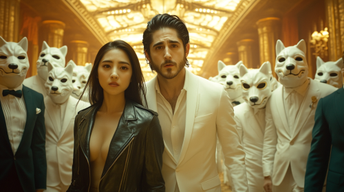 a bored asian woman in a leather jacket walks away from a shocked jake gyllenhaal in a white suit. They are in a ballrom surrounded by suited people wearing white dog masks, highly cinematic, warm lighting --ar 16:9