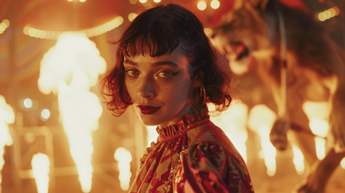 4K image of a marogt robbie the actress, dressed as clown, standing in circus. winking, natural light highlighting her features, and the background lion jumping into ring of fire. Shot with Nikon Z9, cinematic clarity, high-definition detail --ar 16:9 --v 6.0
