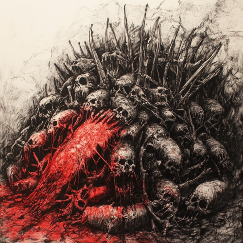 Detailed drawing with red & black Charcoal of a meat pile made of 100000 crawling people, horror, war, Skyrim, demonic, apocalyptic, decay, agony torment, Clive Barker hellraiser style