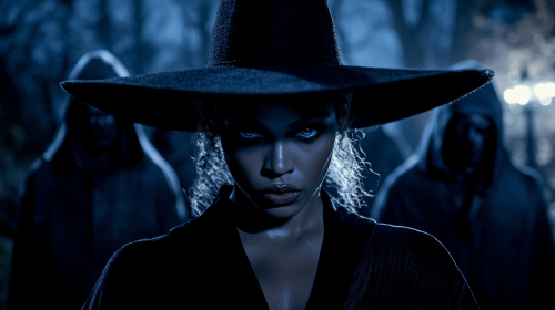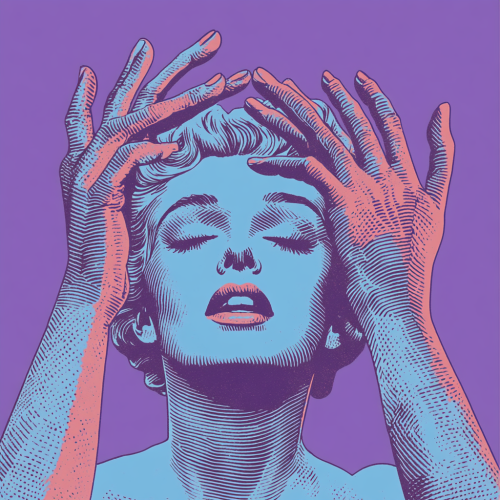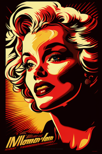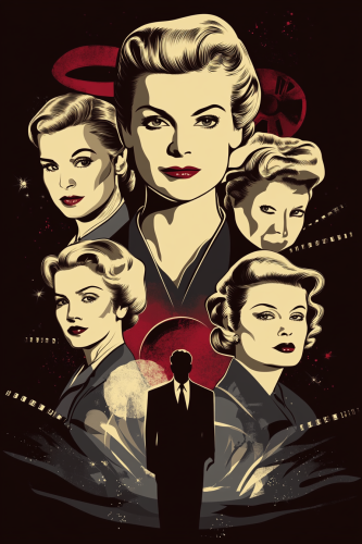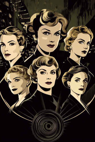 An illustration in a stylized, noir-inspired design featuring five iconic actresses from Alfred Hitchcock's films: Grace Kelly, Tippi Hedren, Kim Novak, Ingrid Bergman, and Janet Leigh. Each actress is portrayed with elegant, distinctive features, capturing their classic, timeless beauty. At the center, a silhouette of Hitchcock himself, subtly imposing yet shadowed, tying the scene together. The background is dark and atmospheric, with vintage film reel and spotlight elements subtly included to enhance the noir aesthetic. pop art style --ar 2:3