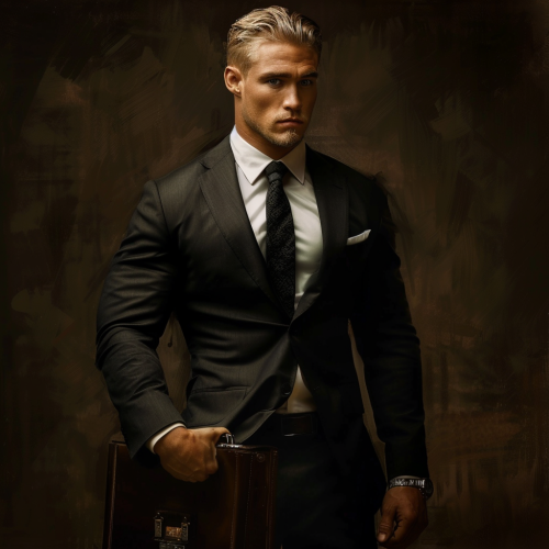 photo realistic gorgeous alpha male all American, similar to Charlie Hunnam and Chris Hemsworth, smolder, groomed blond hair, sophisticated polished suit, friendly smile, lean muscle masculine full body picture holding a briefcase, photo realistic, hd, ultra fine detail, canon 780, ultra high resolution, high quality --v 6.0