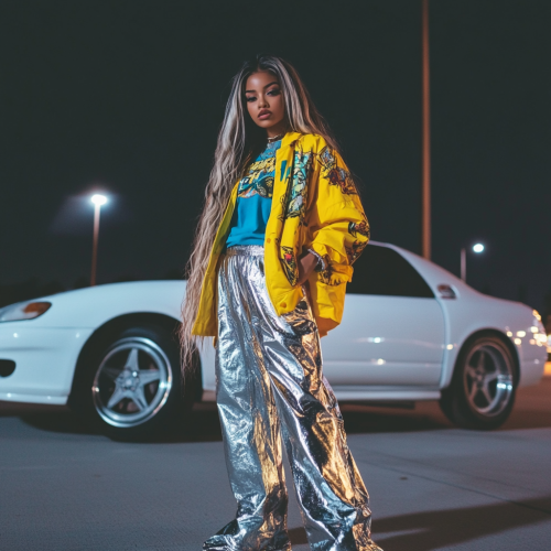MIA singer look like girl wearing a cool outfit with yellow printed jacket blue t-shirt silver pants next to a white sport car at night time fasta and furious inspiration