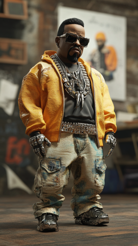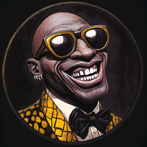 digital illustration, humorous, a Black, bald comedian, in smiling and wearing, sunglasses, wearing formal fashion style and hip hop fashion style, circular image against a black background, caricature style of MAD Magazine