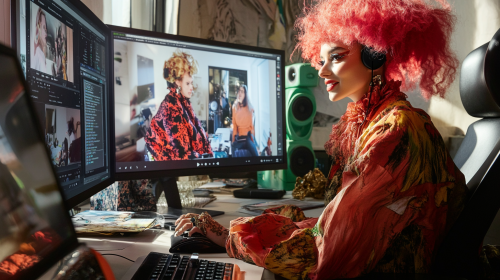A happy fashionable 25 year old sitting at a desk taking part in a Zoom call with two other fashionable 25 year olds, shot by the photographer Nick Knight --ar 16:9