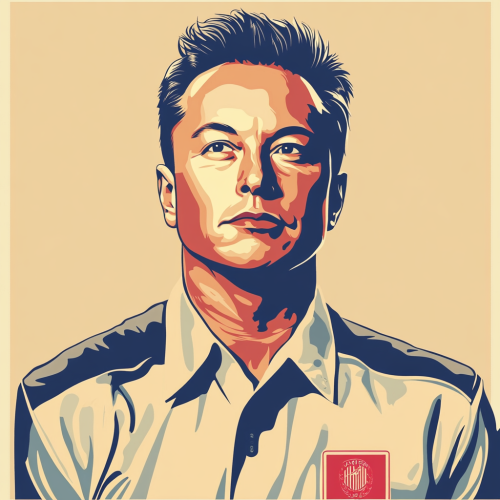 Create a stylized portrait of Elon Musk wearing a USPS uniform, inspired by the iconic Obama Hope poster. Use bold, contrasting colors like red, blue, and beige to give a vintage, pop-art feel. Elon’s expression should be confident and forward-looking, with simplified shading and minimalistic details that capture the boldness of the original poster style. Background should be simple, complementing the uniform, while emphasizing the iconic USPS logo on his shirt.