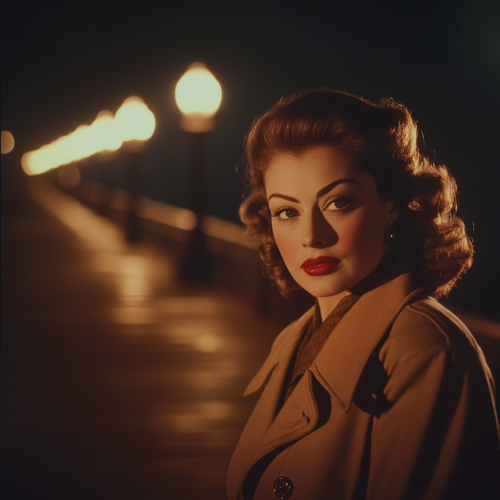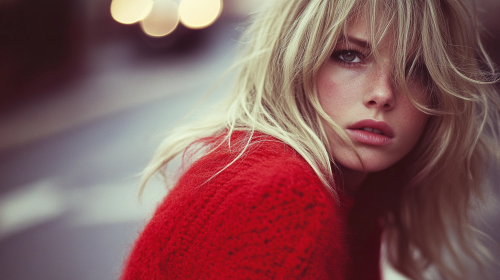 Close-up of a young Julie Christie in 1967 posing for a photographer looking a bit concerned and scared yet trying to be beautiful streets of London at dusk, vivid details,. 1960s styles, clothing and colors, dark stylish shadows and light --ar 16:9 --v 6.1 --style raw --chaos 20