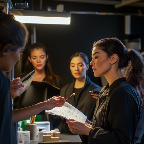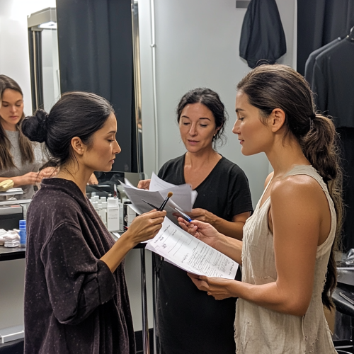 actor in makeup room getting her makeup done.There is a brush on her face. There are 3 staff members standing behind her who are reading from papers and talking to her. Her expression is neutral