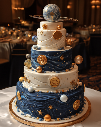 Create a multi tiered birthday cake featuring the solar system with planets and the stars and shooting stars. Cre The base cake is fondant that has a marbleized design using dark blue and sky blue and white and gold. Geode design style. Use blue and white buttercream. Shiny gold royal Icing filigree and paisley and swirls. Use rhinestones and gems. The cake is displayed on a dessert table in a ballroom that has a outer space planetary themed party event. --ar 4:5 --v 6.1 --stylize 500