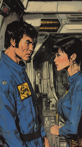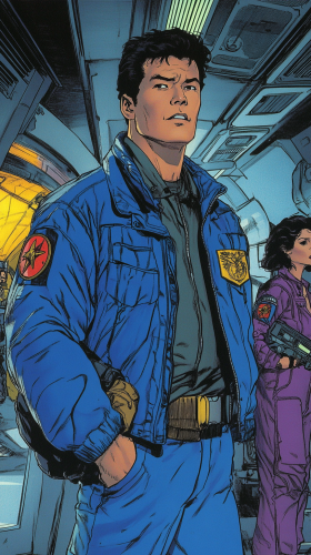 Bruce Lee dressed in a blue jacket and Marshal's badge talking in a starship corridor with Ellen Ripley, comic panel drawn by Walt Simonson, --ar 9:16