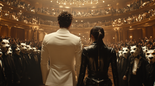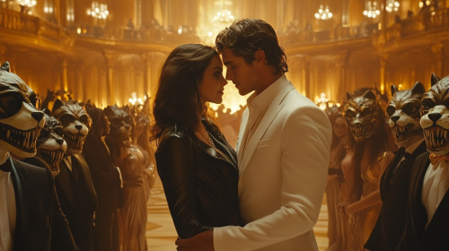 jake gyllenhall wearing a white suit, brings an asian woman in a modern black leather jacket into a large ballroom. THey are watched by a large crowd of people wearing animal masks --ar 16:9