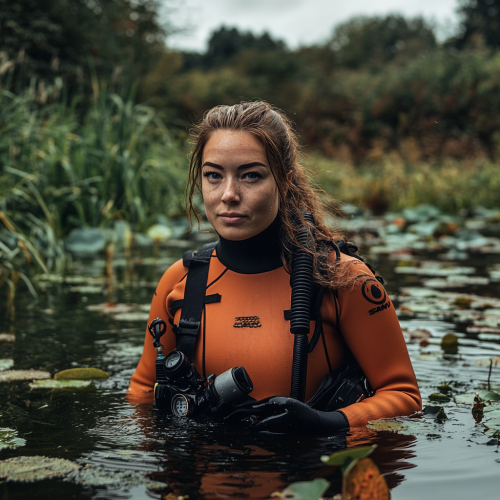 charlotte church in orange wetsuit with tall neoprene turtleneck collar, wearing black bcd and scuba gear snd black neoprene gloves, wading in weedy lake with lily pads and reedbed in background.