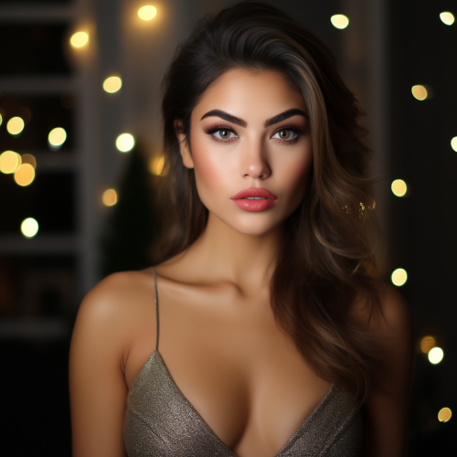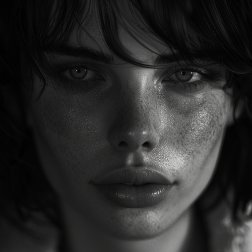 a close up photo realistic black and white mage of Jennifer Connolly’s face looking directly at the camera, straight not angled, the lighting is warm and dark and lighting mostly the left side of her face, high resolution 6.1 --v 6.0 --style raw