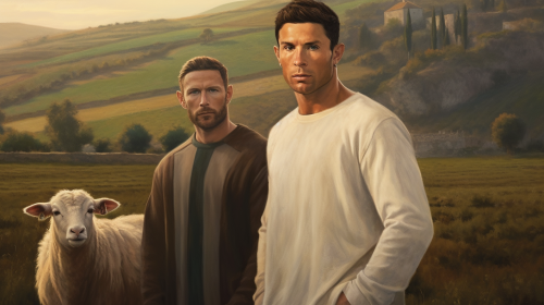 A hyper-realistic portrait of Cristiano Ronaldo and Lionel Messi in a picturesque rural setting. Cristiano Ronaldo, positioned on the left, is wearing a Real Madrid jersey, with defined cheekbones, short dark hair, and an intense, determined expression. He has a strong jawline and piercing eyes, looking confidently at the viewer. Lionel Messi, on the right, is dressed in a Barcelona jersey, featuring a round face, short dark hair, and a neatly trimmed beard. He has a warm, approachable smile and bright eyes, giving a sense of friendliness. They are surrounded by various farm animals like cows and chickens, with vibrant green fields and crops in the background. The scene is bathed in soft, warm sunlight, enhancing their facial features and expressions, with a clear blue sky above --v 5.1 --ar 16:9 --style raw
