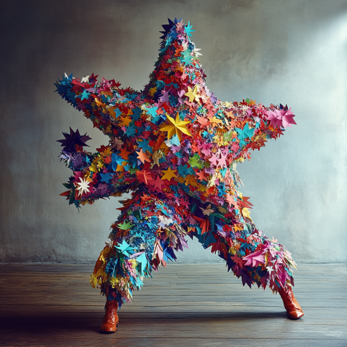 A person wearing an oversized mexican star piñata-shaped costume with paper stars on it, dancing in the studio, in the style of Guy Bourdin and Tim Walker.