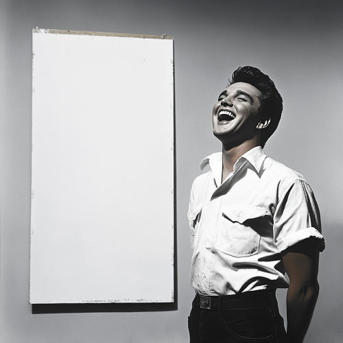 elvis presley is standing in front of a large blank canvas hanging on his wall, he is laughing, the photo is old and slightly blurred, the canvas is all white,