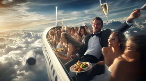 a millionaire and his wife getting off a private jet. the wife is short with brown long hair. the husband is tall with a buzz cut with brown hair. they are fancy dressed