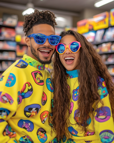 a couple that symbolizes the 90s in every way in matching neon jumpers inside of a blockbuster store they are smiling having fun and they have 90s style sunglasses on, they also look like pokemon --ar 4:5
