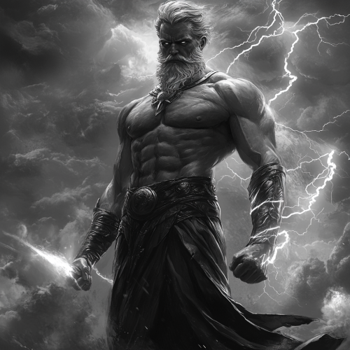 Create a hyper-realistic image of Zeus, the mighty king of Olympus, in all his power and grandeur. Zeus stands with an imposing and authoritative posture, his muscular form accentuated by flowing robes and adorned with symbols of lightning. His face is stern and majestic, with piercing eyes that reflect his wisdom and unmatched strength. In one hand, he holds a thunderbolt crackling with energy, casting an intense light that illuminates his figure. The background reveals a celestial, stormy sky with clouds swirling around him, hinting at the heavens he commands. Capture the awe-inspiring presence of Zeus, showcasing his role as ruler of gods and master of storms --v 6.1