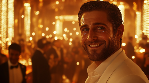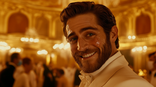 a close of jake gyllenhall smiling at the camera with tears coming out of his eyes. He wears a white suit, the background is a nice warm tungsten lit ballroom, in the background we can see people in suits wearing masks, cinematic photographic, keep him dead center of the frame looking into the camera --ar 16:9