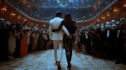 jake gyllenhall wearing a white suit, brings in michelle reiss (from the fallen angels movie) in a black leather jacket into a large ballroom. THey are watched by a large crowd of people wearing animal masks --ar 16:9