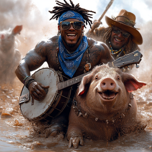 YouTube star KSI wearing blue bandana and with dreads, hog riding a hog in the mud with a large cowboy hat, banjo in hand, both smiling and wearing sunglasses, hyper-realistic