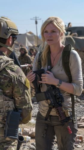 Kirsten Dunst interacting with a war photographer in a conflict zone, preparing for her role in 'Civil War.' Hyper realistic, --ar 9:16 --style raw --v 6.0