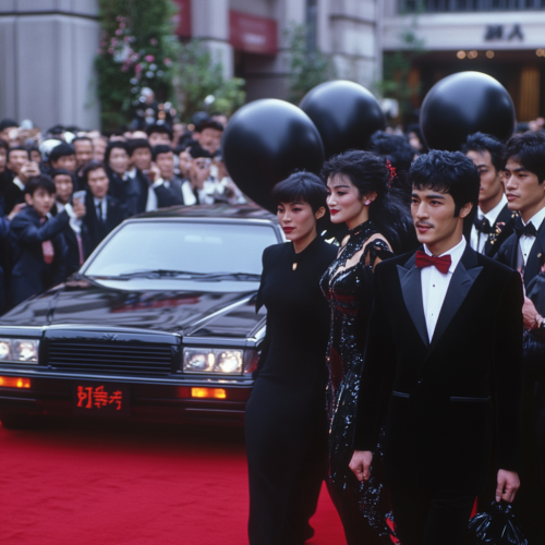 Realistic photo. A very long red carpet was pulled out in front of the crowd of reporters. A black limousine car is parked at the back of the carpet, and in front of it is a man with short black hair in a tight perm, his forehead sticking out, wearing a black tuxedo and red bow tie. Next to me, an Asian woman with long black hair and a perm, parted in the middle and showing her forehead, is walking around wearing a black dress with a tight upper body and a balloon-like, balloon-like, shoulder-length dress. In his hand he holds a pouch with black thorns.