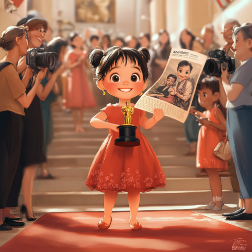 A little girl proudly holding an award stood on the steps of the red carpet. There were many people around taking pictures of the girl. A newspaper flew by with a picture of the little girl printed on it. Pixar cartoon style. Super creative.