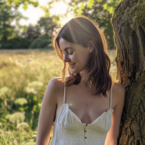 a very cute and beautiful young woman Florence Pugh 32 years old with bob cut wet slicked back blonde hair, an oval face with soft features and golden hazel eyes blushing, smiling with a nice body with wide hips and slim waist with tan skin, wearing a black pajama tank top leaning on a doorway of a cabin running her hand through her hair, 8k --ar 9:16