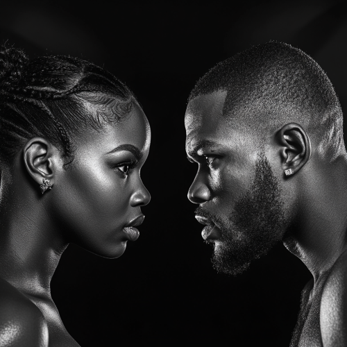 Stormzy squaring off against Rhianna. Facing each other like in a boxing stand off. Photo realistic. Both look composed, calm, concentrated but also slightly menacing.