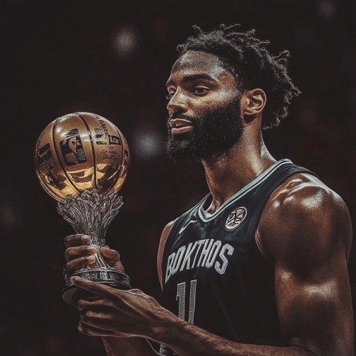 picture of the Brooklyn nets winning the NBA Championship. Cam thomas holding the NBA Finals trophy after brooklyn wins the finals. Super realistic. Make sure CAMERON THOMAS IS HOLDING THE TROPHY