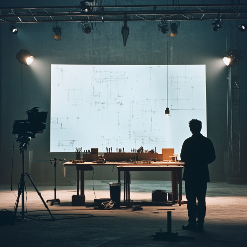 A split-frame scene: on one side, a large, sleek podium with flashing cameras and microphones focused on a silhouetted figure; on the other side, a builder’s workbench piled with tools, plans, and rough sketches. The podium represents the spotlight-seeking celebrity, while the workbench signifies the real, thoughtful labor behind building something of substance.