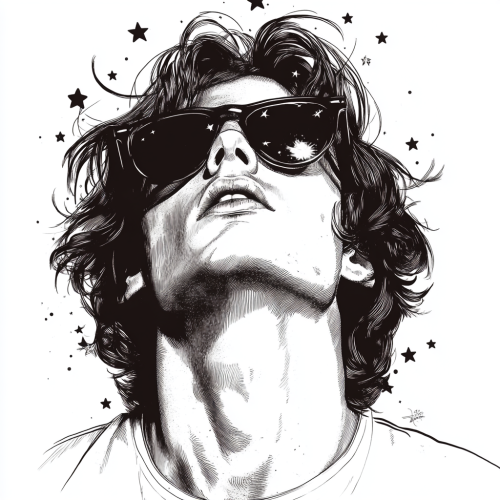 a black and white drawing of an attractive actor, wearing sunglasses, stars around their head, high resolution, cool design, on white background --s 250