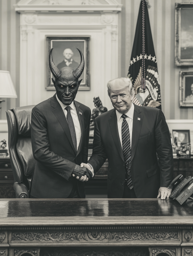 Vintage photo of an evil-looking demon wearing a suit and tie with horns, standing behind a desk in the White House office shaking hands with elon musk, donalds trumps is standing beside both of them, with a 1960s aesthetic, vintage film grain, and a vintage feel, shot with leica m3 --ar 3:4 --s 750 --q 2