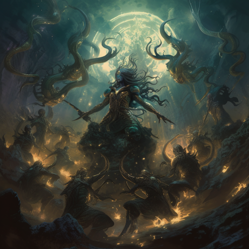 An elite force known as the Legion of Medusa, stands fearlessly against a massive, roiling abyss of dark energy, their fierce serpent heads glowing with potent, high-vibrational power. Their scales pulse with intense, radiant energy, forging a nearly impenetrable barrier that obliterates all malevolent forces attempting to breach it. Each Medusa servitor radiates a lethal grace, exuding pure, unstoppable fiery intense aggression, unleashing torrents of quantum-charged fiery golden light rippling in waves. Celestial beams cut through the darkness, highlighting every figure in radiant illumination. Photographed by Mario Testino using a Canon EOS-1D X Mark III, studio lighting, volumetric lighting, 8K, Ultra-HD, Super-Resolution. --v 5.0