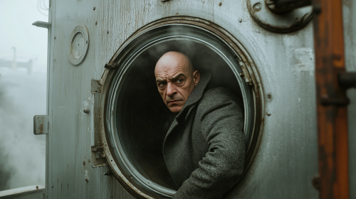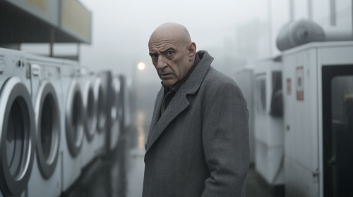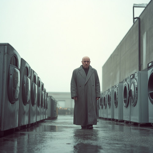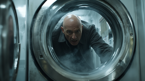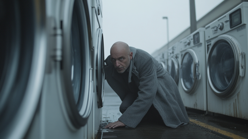 Close up of a bald Telly Savalas crawling inside a massive front loading washing machine, he halfway inside it wearing a grey longcoat on a loading dock surrounded by other washing machines ,an eerie fog and glow, fog and grey overcast skies, shallow depth of field, 50mm lens --ar 16:9 --v 6.1 --style raw