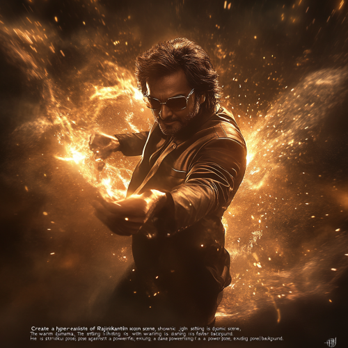 "Create a hyper-realistic image of Rajinikanth in a dynamic action scene, showcasing his iconic style and charisma. The setting is dramatic, with warm lighting illuminating his features against a darker background. He is striking a powerful pose, exuding confidence and intensity, surrounded by elements that suggest motion, like swirling dust or dramatic shadows. Capture the essence of a cinematic moment, highlighting his signature gestures and expressions that convey strength and charisma."