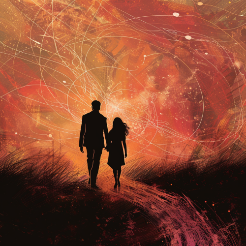 Silhouettes of Shahrukh Khan and his daughter Suhana walking side by side on a winding path. The path stretches from foreground to background, symbolising a journey. Soft, golden hour lighting with long shadows. Abstract speech bubbles or sound waves float between them, representing conversation. Background transitions from realistic to slightly abstract, with warm oranges, reds, and purples of a sunset sky. Elegant, minimal typography at the bottom for show details. Art style: blend of photography and impressionistic painting. Emphasis on emotion and connection between father and daughter. 8K resolution, ultra-detailed. --v 6.0
