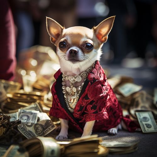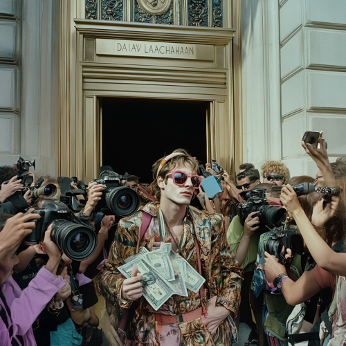 In the surreal, hyper-realistic style of David LaChapelle, a scene unfolds outside a grand, classical art gallery. The gallery's sign hangs above the door, and outside, dozens of paparazzi scramble to take photos. The focus of their attention is a single artist, standing confidently at the entrance with his pockets stuffed with money, some of it visibly sticking out. The artist, dressed in an eccentric, high-fashion outfit, seems unfazed by the chaos around him as flashes of cameras light up the scene. The paparazzi, with their oversized lenses and chaotic movements, surround him, desperate for the perfect shot. The tension between the artist’s wealth and fame and the paparazzi’s hunger for a scoop creates a vivid, surreal moment, as the sealed doors of the gallery remain locked behind them, hinting at the mysteries inside. The combination of wealth, fame, and mystery unfolds in a chaotic yet glamorous scene, perfectly captured in LaChapelle’s bold and dramatic photographic style.