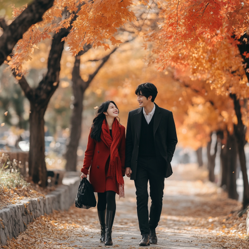 A picturesque walkway with maple trees , leaves falling Korean actress Kim Go-eun wearing red woollen scarf , walking with actor gong yoo in a beautiful backdrop , they are calm and happy, it’s a beautiful evening